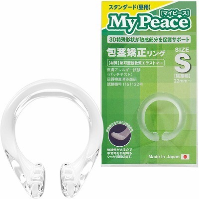 誰にもバレずに矯正可能!悩める包茎さんの為の矯正リング。●フィット力の高いエラストマー製●裏筋に当たらない絶妙C型リング●日常使用にお勧めのスタンダード●平常時・勃起時いつでも装着可能●両端の特殊な3D凹凸でズレを防ぐ●皮膚アレルギー試験クリアで安心●SMLの3サイズ中、Sサイズタイプ。【使用方法】包皮を剥いて亀頭を露出→リングの開きを裏筋側にして装着→リングが皮戻りを防いで矯正。伸縮性に優れた包茎矯正リング「マイピース」は、この他にM(b25061)とL(b25062)、ソフト夜用のS(b25057)とM(b25058)とL(b25059)の計6種類を展開。普段はスタンダード昼用、寝る時はソフト夜用、と使い分けるのもおすすめです。
