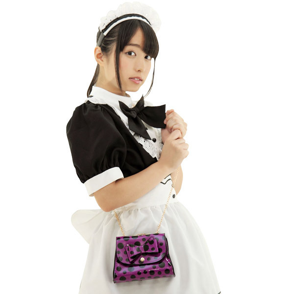 ●紫×黒×金の小悪魔カラー●大小様々なマルチドット柄●パカッとOPENできるタイプ●フタ部分に立体リボン付き●ゴージャスな金色チェーン。