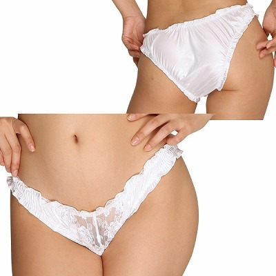 ●サテンのような輝きのフェリカ生地●眩しいほどのピュアホワイトカラー●ローライズ気味な浅めの履き込み●ウエストと足ぐりにたっぷりフリル●フロントはシースルー×バラ柄刺繍●ヒップに映えるハーフバック仕様。
