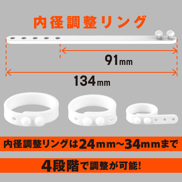 皮戻りや持続力アップなどマルチに活躍!内径23mmの小、内径26mmの中、内径30mmの2連リングに加え、好きなサイズに調整できる内径調整リングの4個セットになっているので、個人の身体に合わせてお使いいただけます。