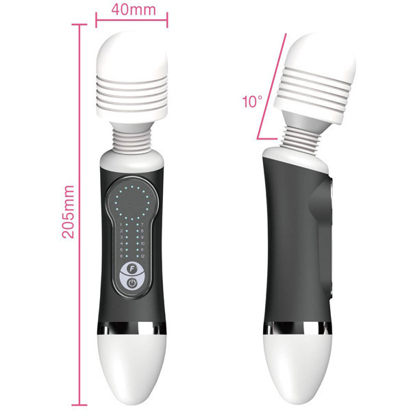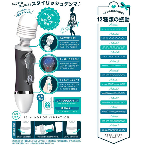 ●黒×白のスタイリッシュなカラー●全長20cmほどの使いやすいサイズ●ヘッド部分は当てやすく10度傾斜●電源ON/OFFともにワンタッチ操作●Fボタンで12種類パターン切り替え●振動と連動する鮮やかライト機能●メンテナンスしやすい生活防水。