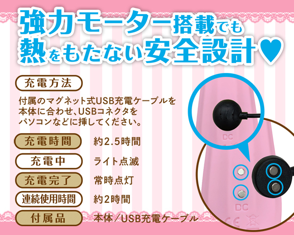 ▼仕様:パッケージ:28.0×8.0×5.3cm 本体:全長21.0cm・ヘッド径5.0cm セット内容:本体、充電ケーブル USB充電式