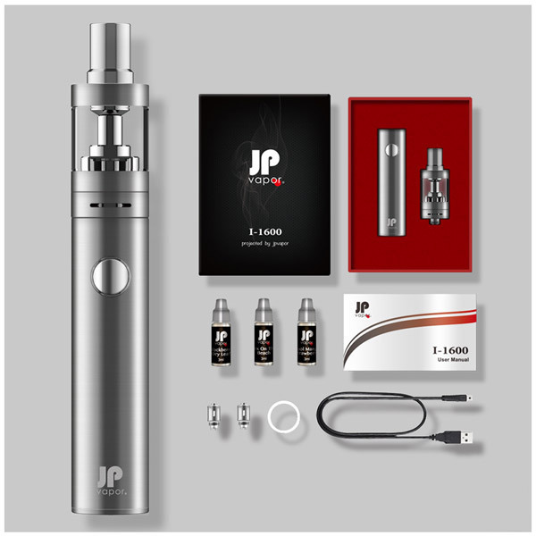 快適なVAPE(ベイプ)ライフをすぐに始められる特製BOX入りのフルセット!電子タバコのペン型ヴェポライザー「JPvapor I-1600 スターターキット シルバー」。
